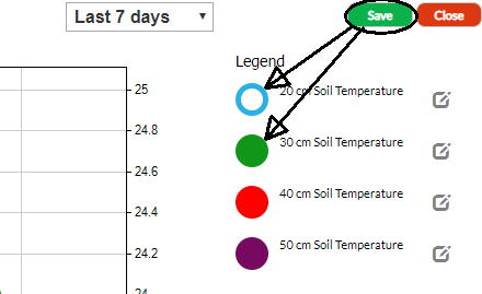 If the coloured circle is full then that series is turned on and will appear on your graph (shown by green, red and purple circles below). If the coloured circle shows white in the middle then the series is turned off and will not appear on your graph (shown by blue circle below).