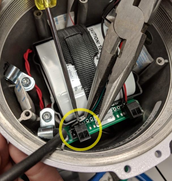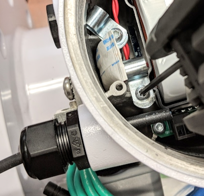 - Unscrew cable gland plug “Power/Output Cable 2” located closest to the terminal strip (left hand side). You may have to use a wrench and/or pliers to remove it.