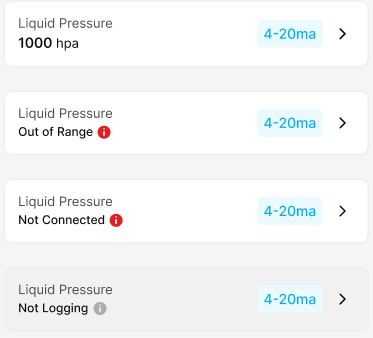 Each input or sensor will now show status messages (eg Out of Range, Timeout, Not Logging, Calculating, Error Calculating) |
