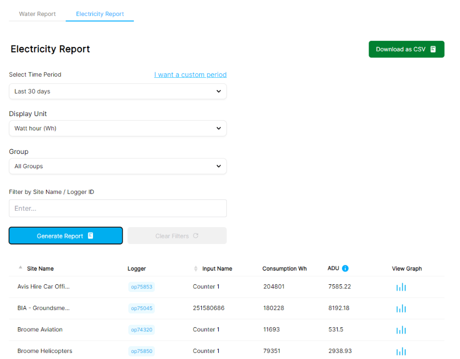 We have a new type of report, covering Electricity and Water consumption, available as a CSV download. When enabled, any input with measurement category of Electric Energy will show on our new Electricity Meter Consumption Report. |